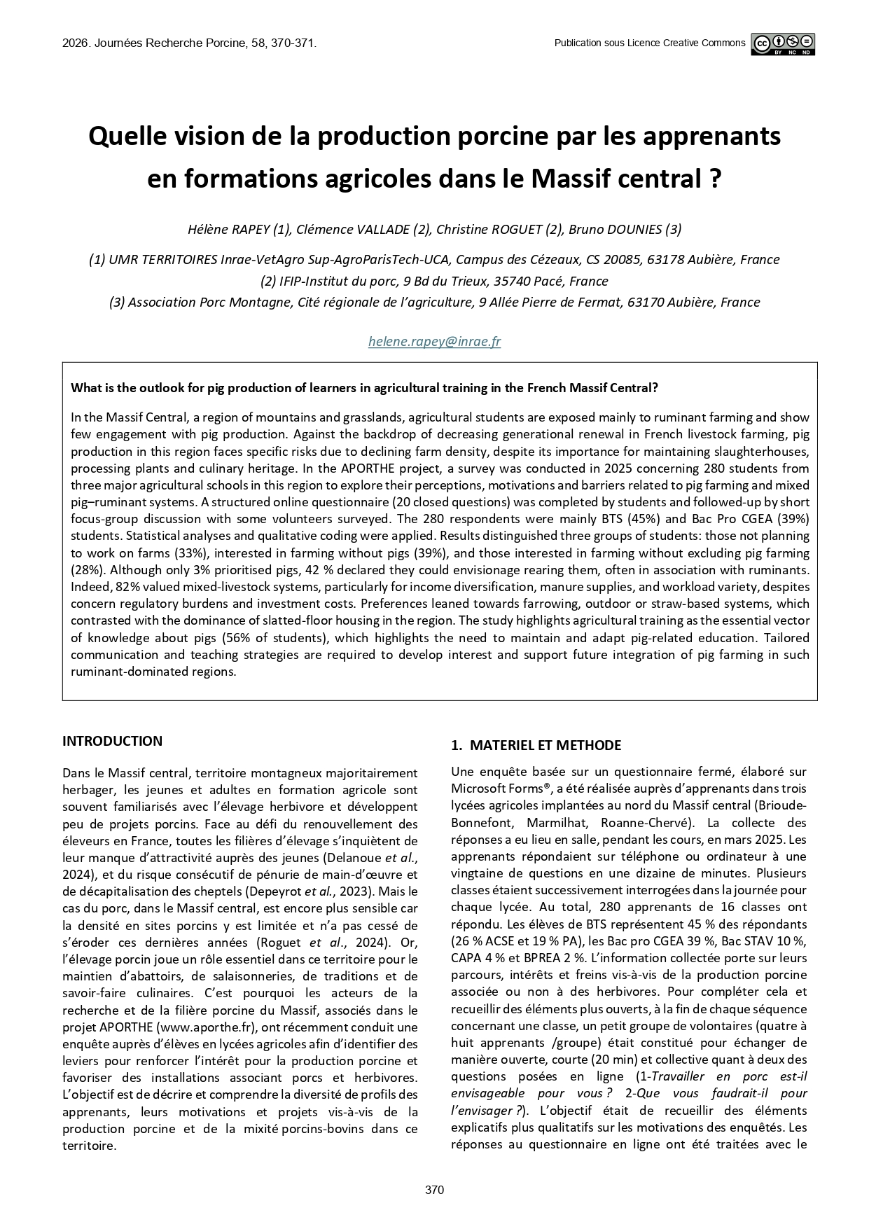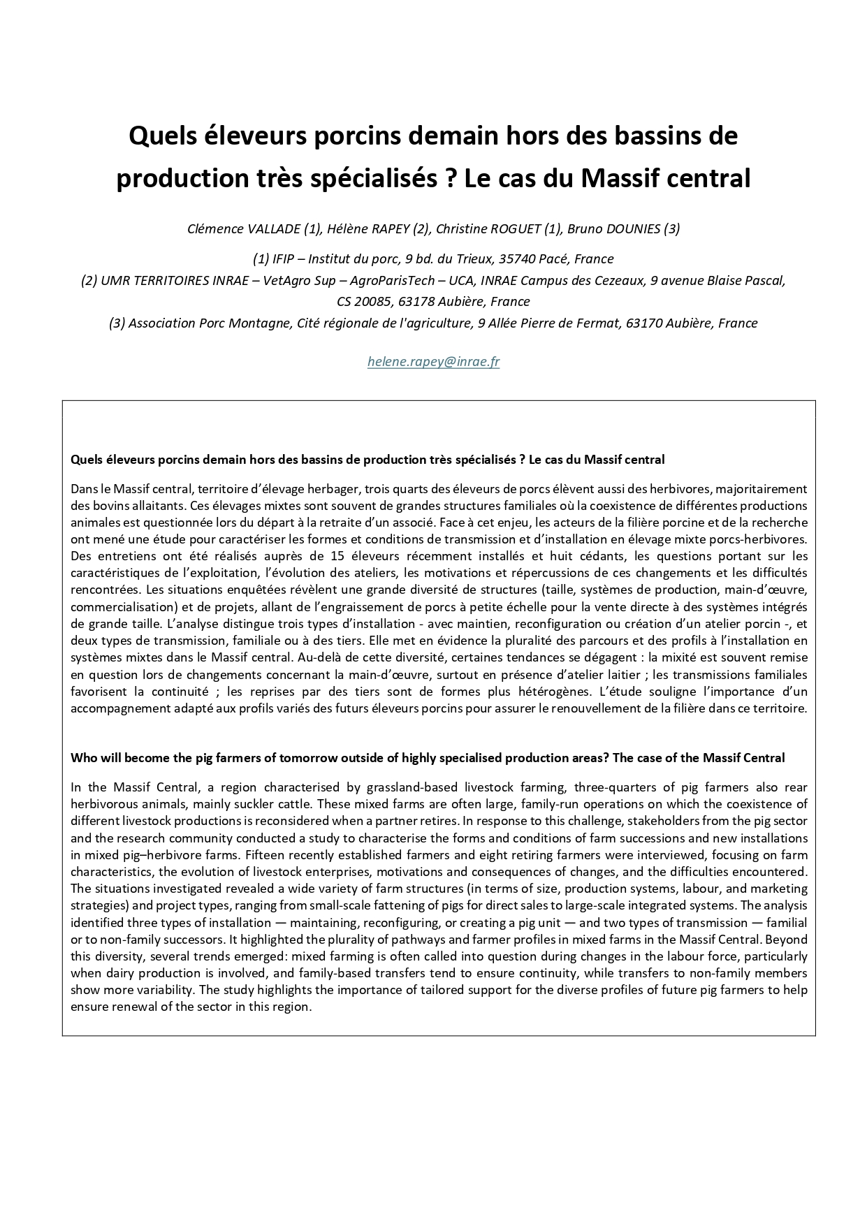 Publication scientifique sur les résultats de l’enquête postale auprès des éleveurs de porc du Massif central lors des Journées de la Recherche Porcine 2019.